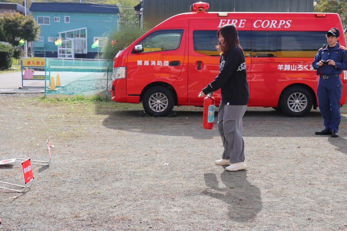 その後、先生たちで消火訓練。大きな声で2度「火事だ!」と叫んでから、消火器を持ってほうきで掃くように消します。