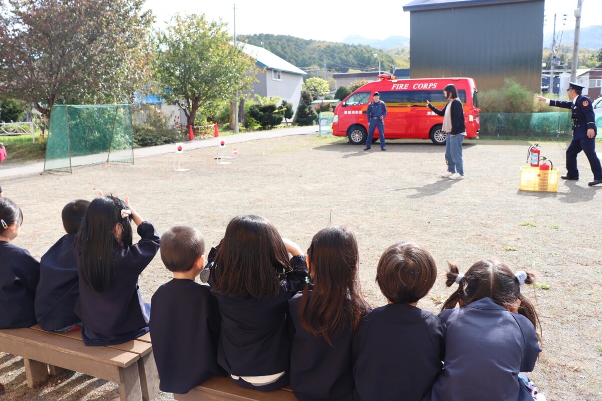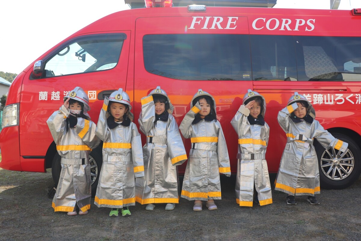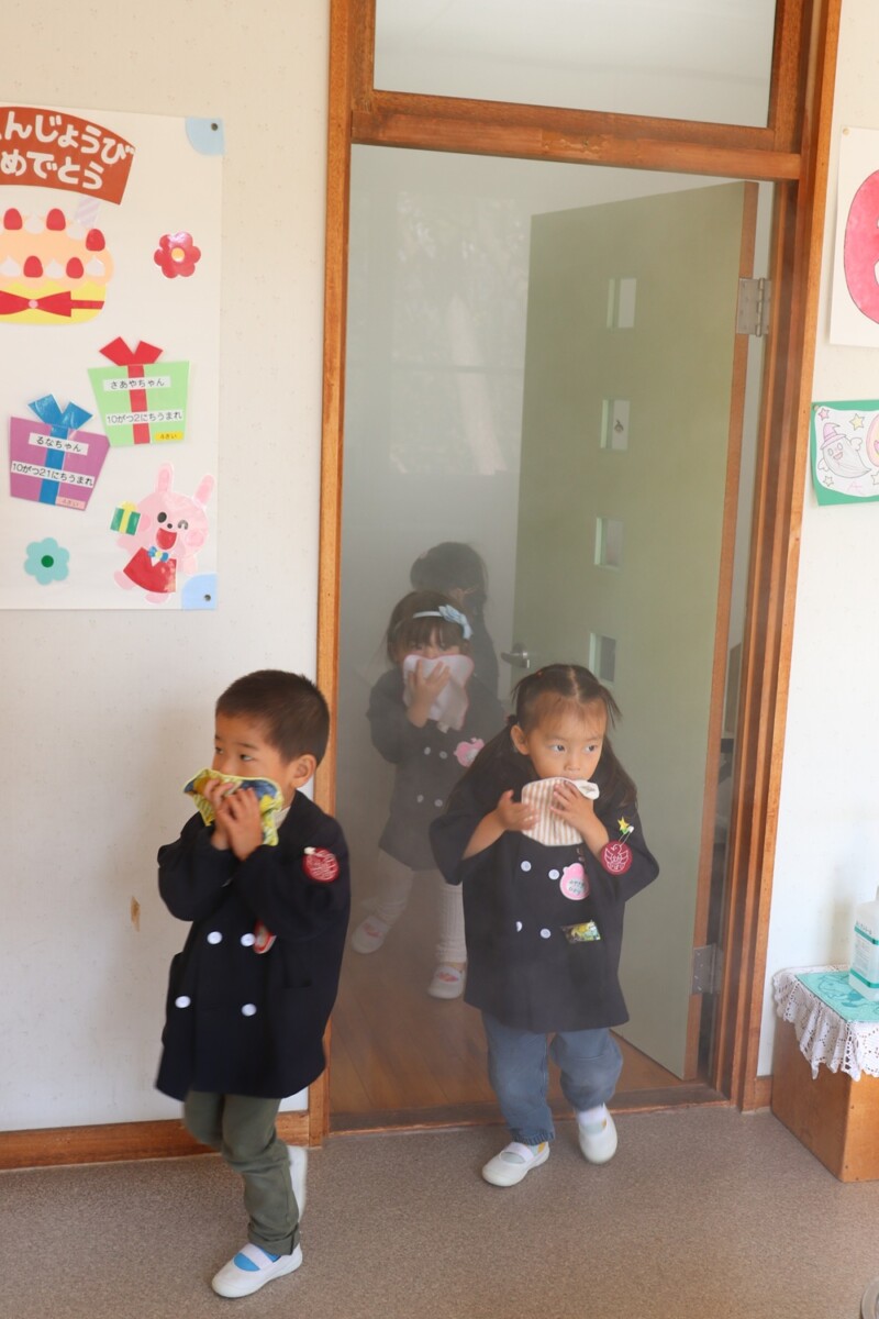 10月17日、蘭越消防署員の方に来園していただき、火災を想定した避難訓練をしました。「お・は・し・も」の合言葉を知っている子ども達。慌てず、騒がず、上手に逃げました。