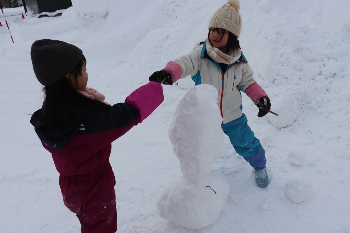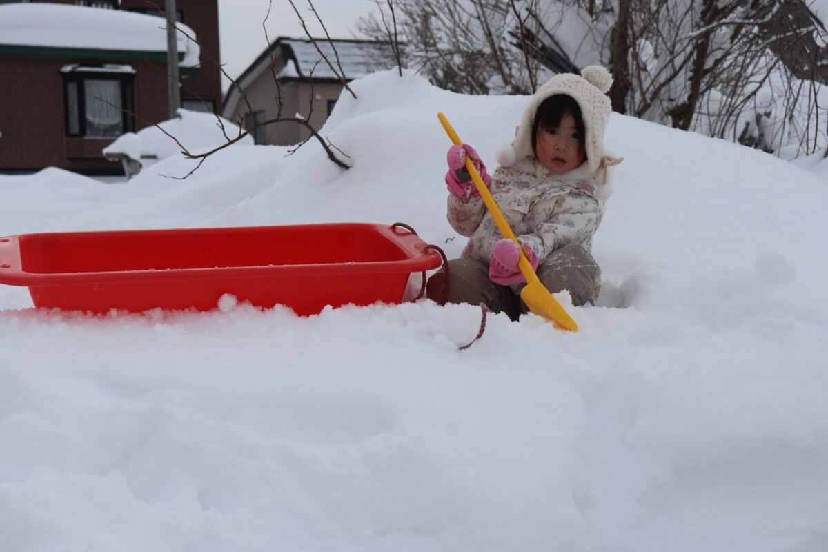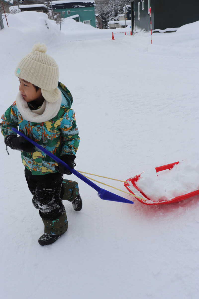 スコップを手に、せっせと雪集め。
