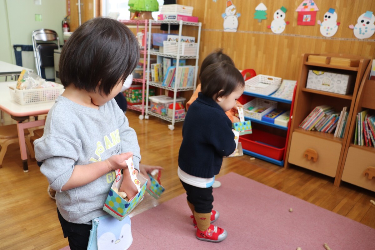 2026.02.03 園ブログ ひまわり組の豆まき ひまわり組のかわいい鬼が揃いました。 さぁ、豆をまくよ。豆をいっぱい持って… ひまわり組がクレヨンで塗った赤鬼めがけて、「おには~そと」と豆まきです。